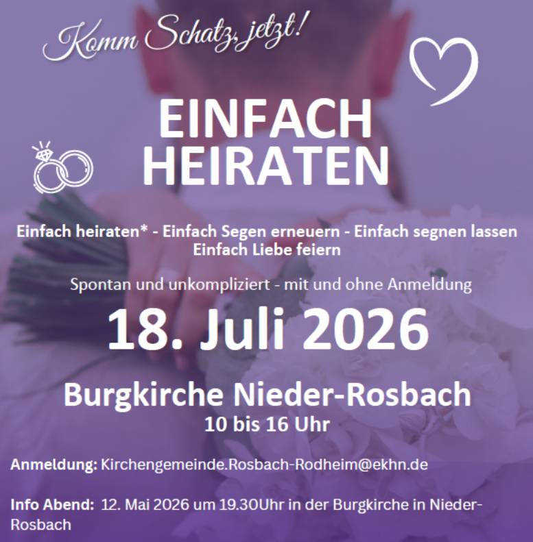 Kirchlich heiraten ohne viel Stress und Vorbereitung – das ist im Sommer 2026 im Evangelischen Dekanat Wetterau wieder möglich. Dabei können sich Paare spontan oder mit Anmeldung das Ja-Wort geben oder ihre Beziehung segnen lassen.